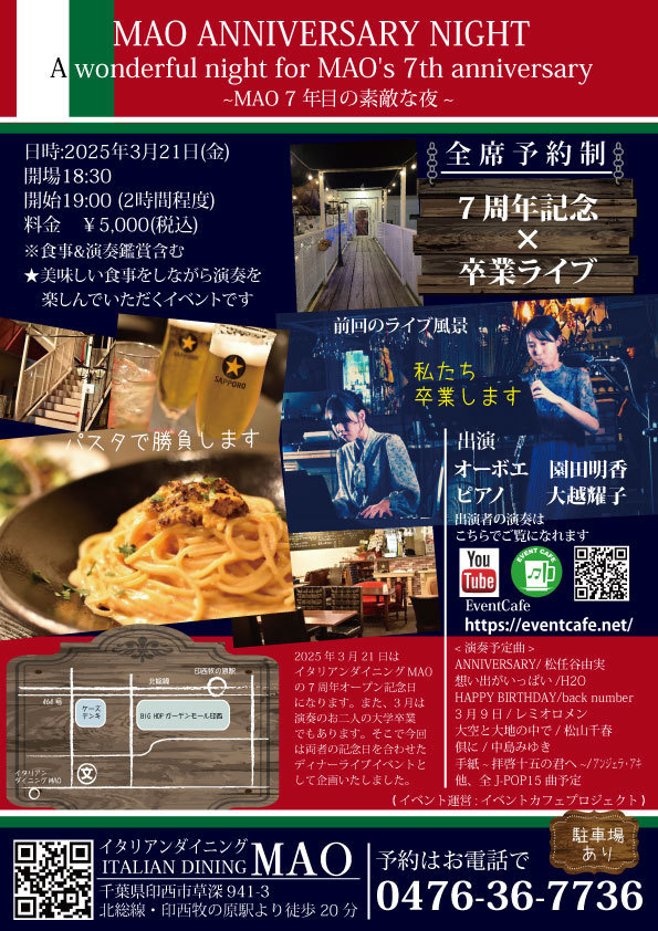 同レストランの7周年記念&演奏者お二人の卒業記念ライブになります