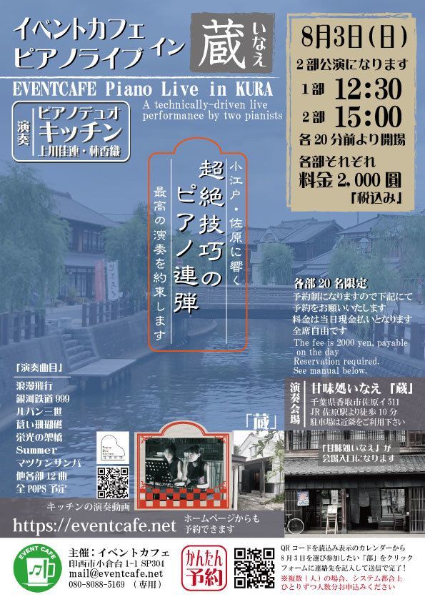 千葉県の香取市、小江戸の街並みが美しい「水郷佐原」に所在します人気店"甘味処いなえ"の中庭にあります「蔵」にてピアノ演奏会を開催いたします。